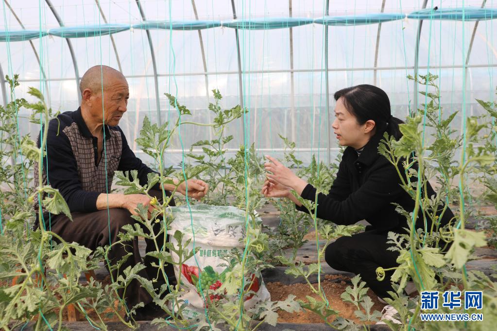 4月9日,在焦作市温县温泉街道觉世头村,“乡村振兴指导员”田春花(右)在了解大棚西瓜种植管理情况。新华社发(徐宏星 摄)