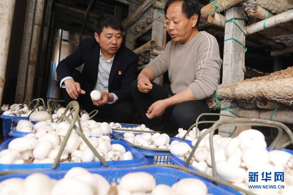 4月9日,在焦作市温县番田镇东留石村,“乡村振兴指导员”张文峰(左)在村里一家农业合作社了解双孢菇生产情况。新华社发(徐宏星 摄)