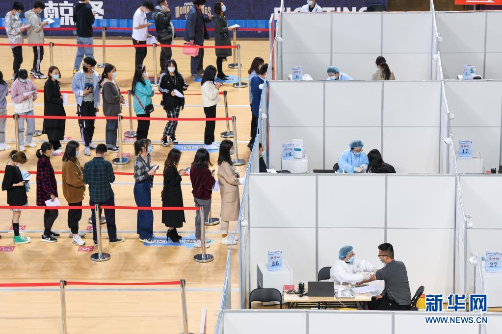 4月9日,市民在南京市鼓楼区五台山体育中心设置的新冠病毒疫苗集中接种点接种疫苗。近日,江苏省南京市在鼓楼区五台山体育中心设置新冠病毒疫苗集中接种点。这是目前南京市最大规模的集中接种点,单日接种量可达10000剂次。新华社记者 李博 摄