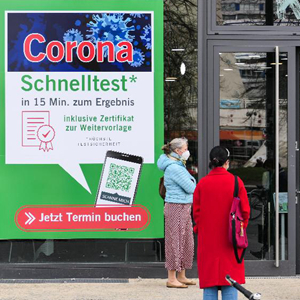 4月9日,在德国首都柏林,人们在一处新冠检测点外排队等候。