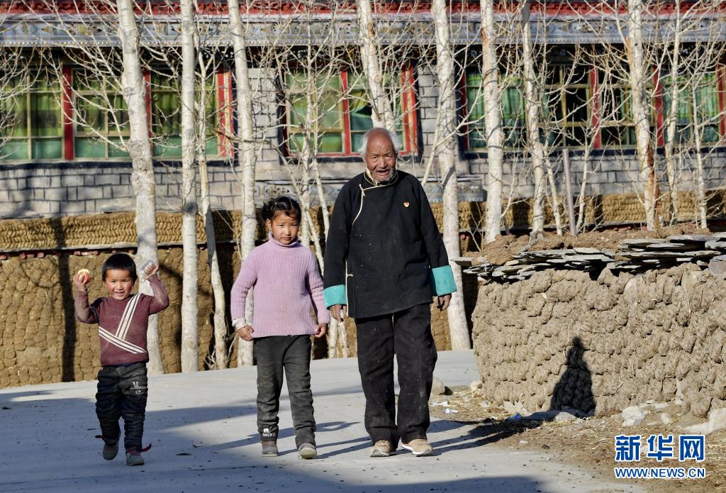 达国杰和孙子孙女在村子里散步(3月22日摄)。