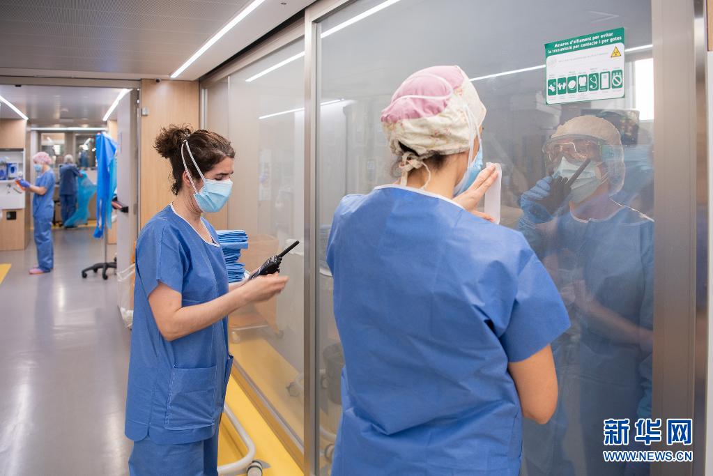 4月8日,在西班牙巴塞罗那医院,病房内外的医务人员用手势交流。新华社发(弗朗西斯科·阿维亚摄)
