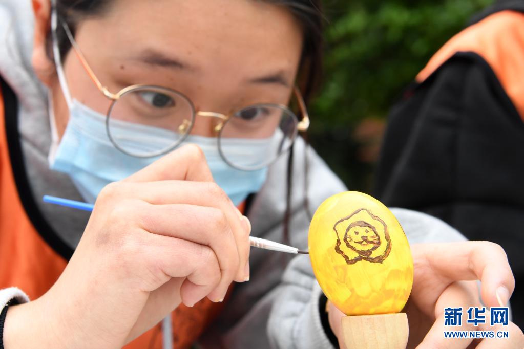 4月10日,志愿者进行鸟蛋绘画创作。新华社记者 唐奕 摄