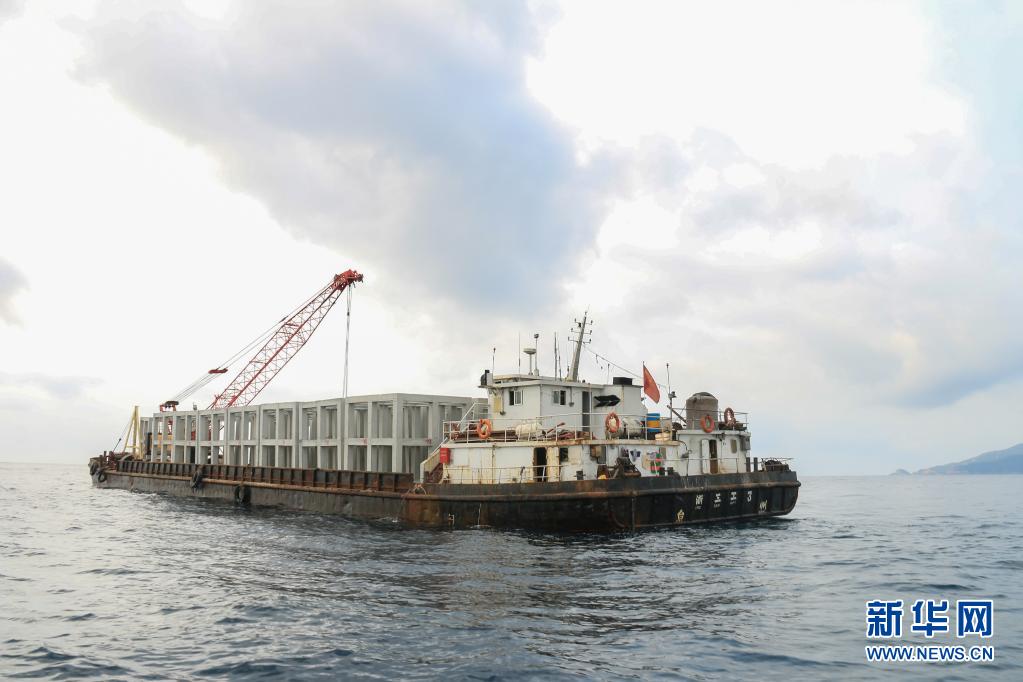 这是4月1日在海南三亚蜈支洲岛海域拍摄的运送人工鱼礁的船只。新华社记者 周佳谊 摄