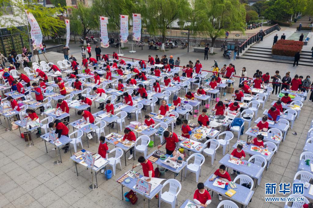 4月10日,100位来自长兴县雉城街道社区的居民、企事业单位员工、文艺爱好者、中小学生共同参加“全民艺起来”全民艺术大赛百人书画现场创作(无人机照片)。