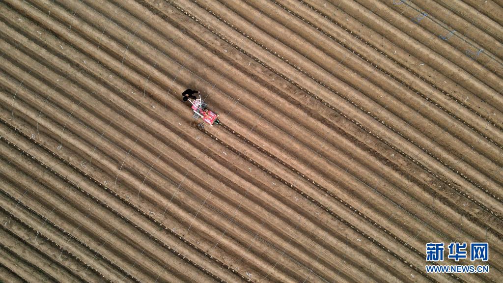 4月10日,河北邢台经济开发区沙河城镇北关村农民在种植生姜(无人机照片)。连日来,河北邢台经济开发区农民抢抓农时种植生姜,田间一派繁忙景象。新华社记者 牟宇 摄