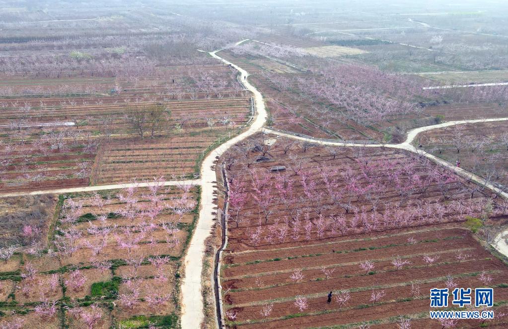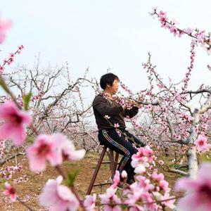 近日,北京市平谷区王辛庄镇的桃花盛开,果农疏花剪枝,游人拍照留念,一派浓浓春意。