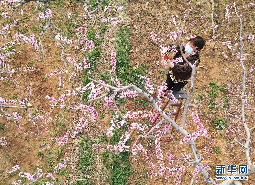 近日,北京市平谷区王辛庄镇的桃花盛开,果农疏花剪枝,游人拍照留念,一派浓浓春意。
