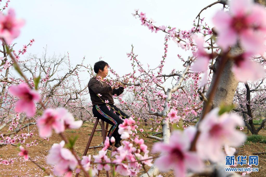 4月10日,在北京市平谷区王辛庄镇北辛庄村,果农为桃树疏花。