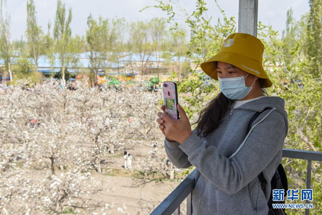 4月10日,游客在新疆库尔勒市阿瓦提乡拍摄盛开的梨花。新华社记者 丁磊 摄