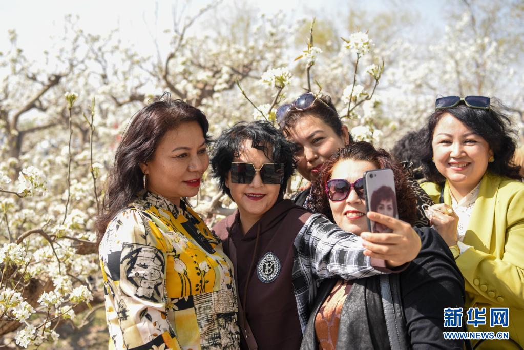 4月10日,游客在新疆库尔勒市阿瓦提乡自拍留念。新华社记者 丁磊 摄