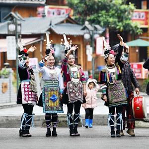 4月10日,在贵州省江口县寨沙侗寨,演员和村民在村旁的小河边排练民族歌舞。