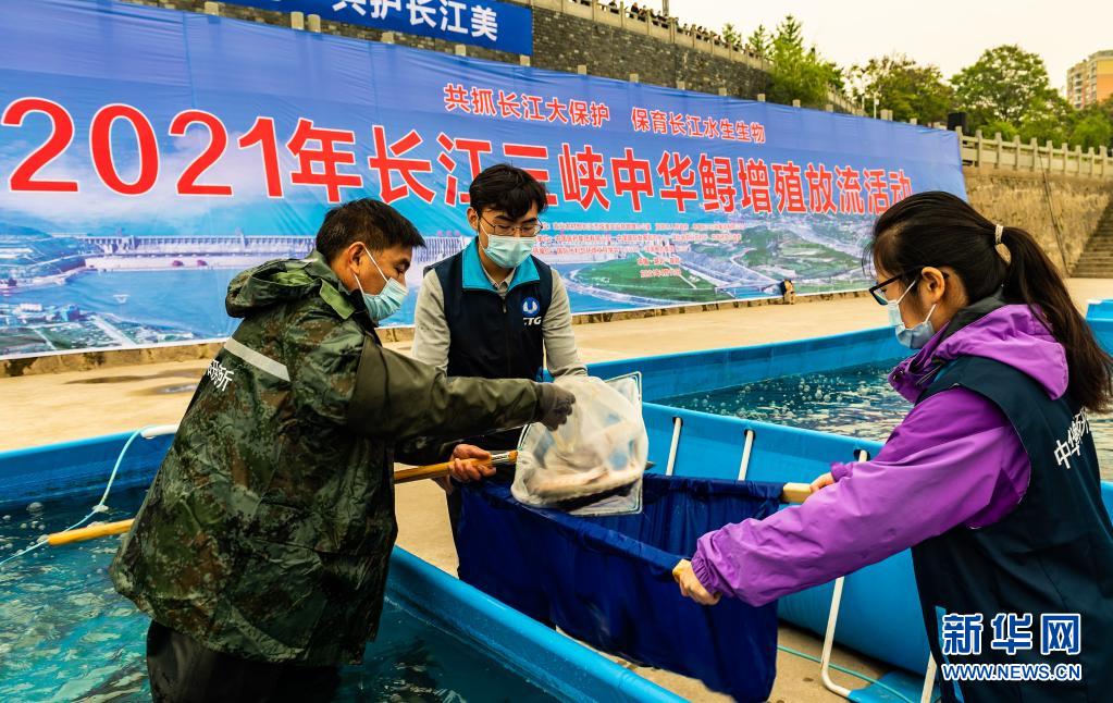 4月10日,工作人员转运中华鲟准备放流。新华社发(郑家裕 摄)