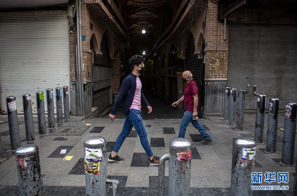 4月10日,在伊朗首都德黑兰大巴扎,行人走过关闭的商店。