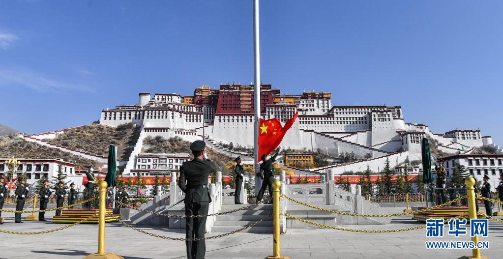 布达拉宫广场举行升国旗唱国歌仪式,庆祝西藏百万农奴解放纪念日(3月28日摄)。