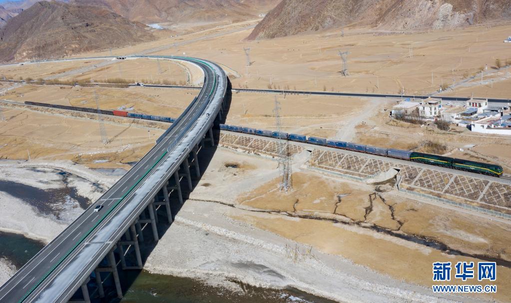 这是拉萨至那曲高等级公路和青藏铁路沿线风光(1月28日摄,无人机照片)。