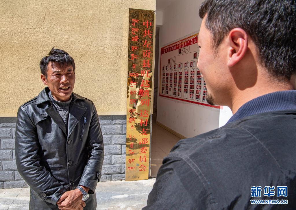 在昌都市左贡县旺达镇列达村,罗松旺堆(左)和村民交流(3月28日摄)。
