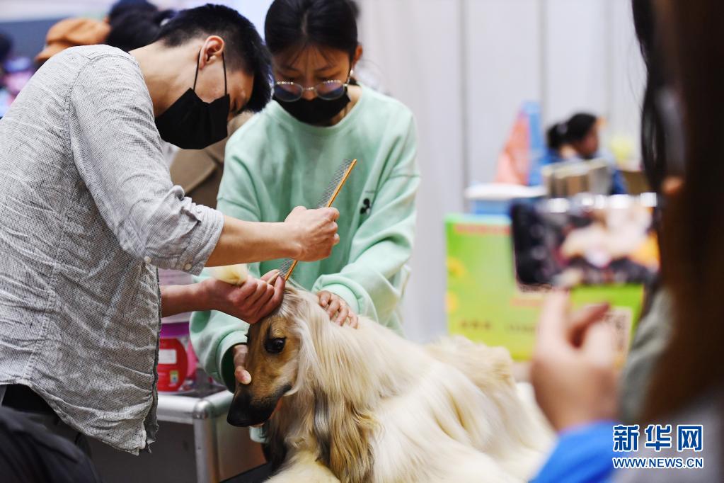 这是4月10日在中部(郑州)宠物水族博览会上拍摄的宠物美容项目。
