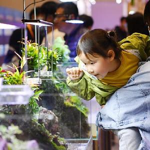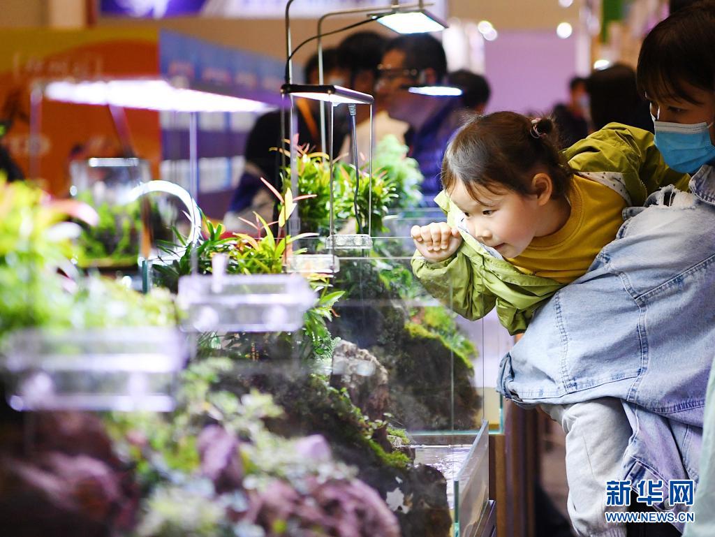 4月10日,小观众在中部(郑州)宠物水族博览会上参观水族用品。