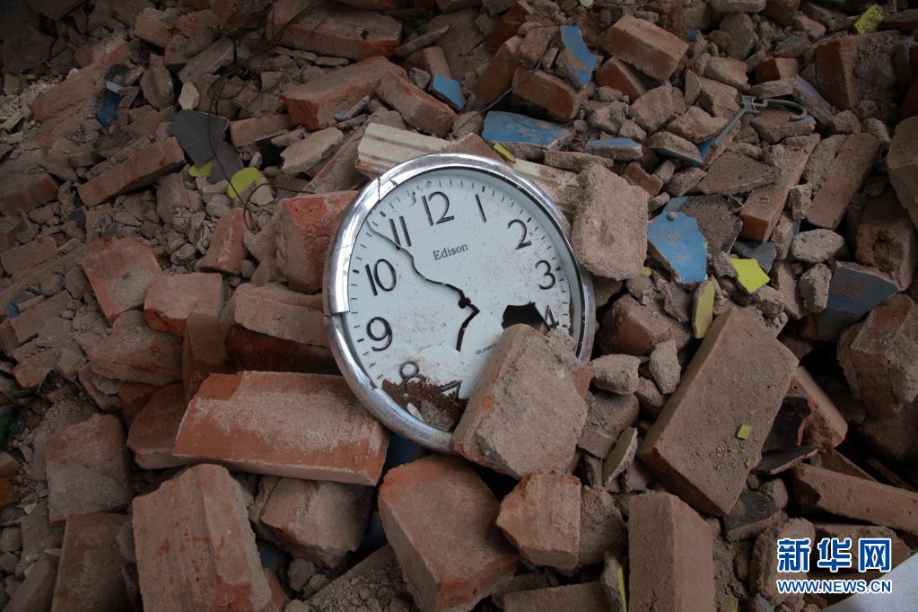 这是4月11日在印度尼西亚东爪哇省玛琅一个村庄的震后废墟上拍摄的损坏的钟表。