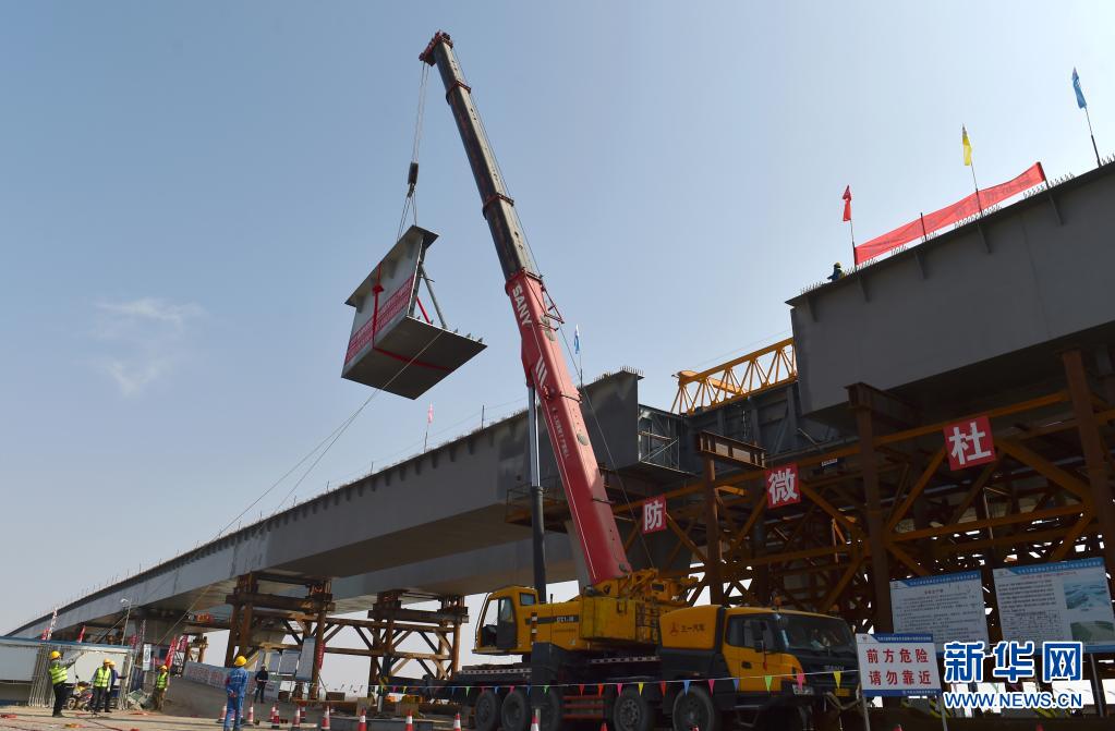 4月11日,乌玛高速公路镇罗黄河特大桥合龙施工现场。新华社记者 唐如峰 摄
