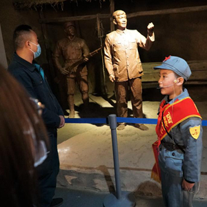 青海西宁红军小学学生马成斌(右)在中国工农红军西路军纪念馆,讲解红九军军长孙玉清烈士的故事(4月7日摄)。新华社记者 严赋憬 摄