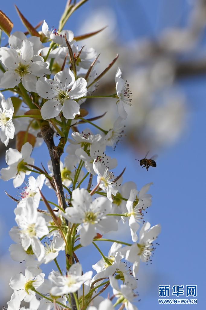 4月11日,在铁门关市一处梨园,蜜蜂在授粉。新华社记者 丁磊 摄