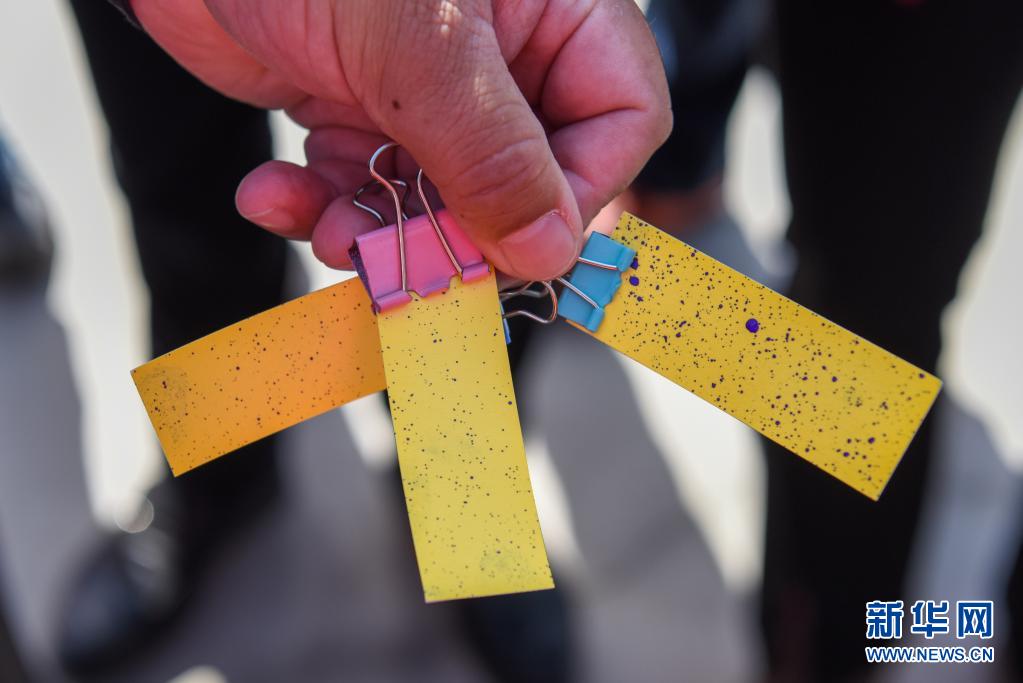4月11日,在铁门关市一处香梨示范园,技术人员检验植保无人机花粉喷施效果。新华社记者 丁磊 摄