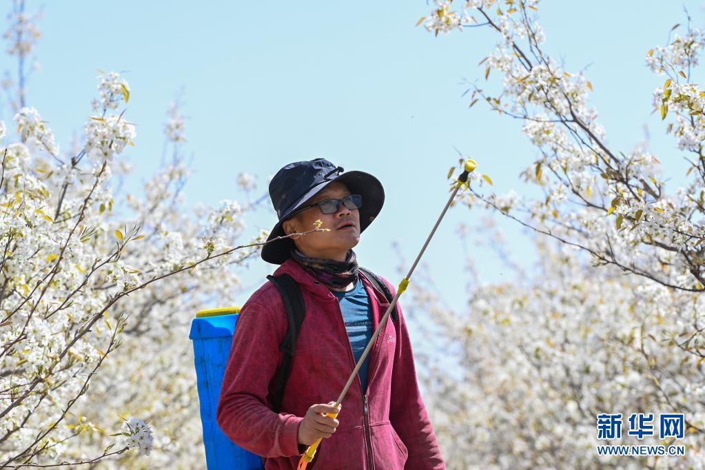 4月11日,在铁门关市一处梨园,梨农为梨花授粉。新华社记者 丁磊 摄