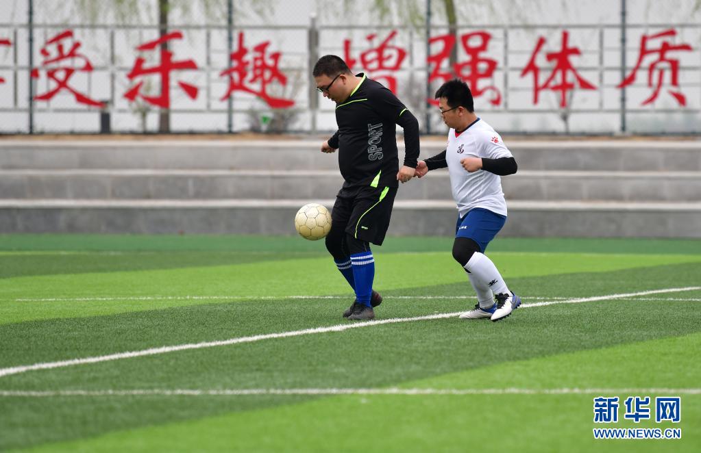 4月11日,市民们在河北省迁安市伟华青少年足球训练活动中心球场上踢球。