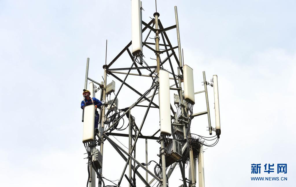 4月9日,在山西省运城市平陆县郭原村,通信基站维修人员在进行日常基站维护作业。