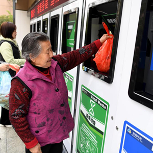 4月12日,在淝南社区垃圾分类投放站,居民使用智能垃圾分类回收柜投放垃圾。