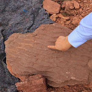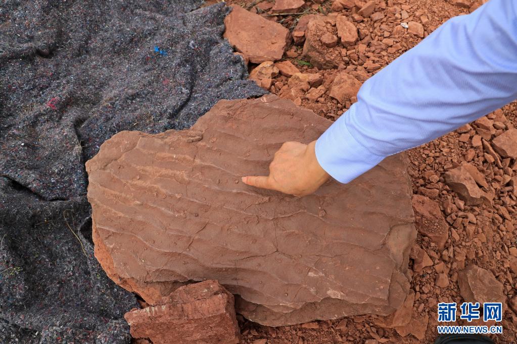 这是波痕沉积结构化石和晚白垩世恐龙同时期的底栖生物潜穴化石(4月6日摄)。