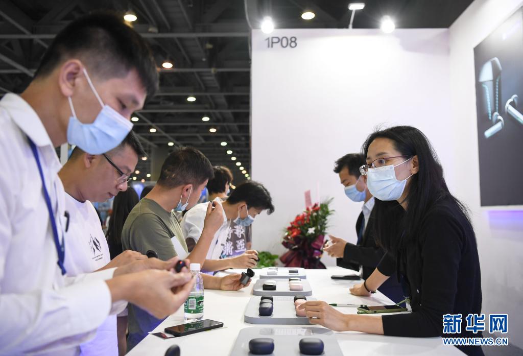 4月12日,参观者观看展会上的无线耳机。