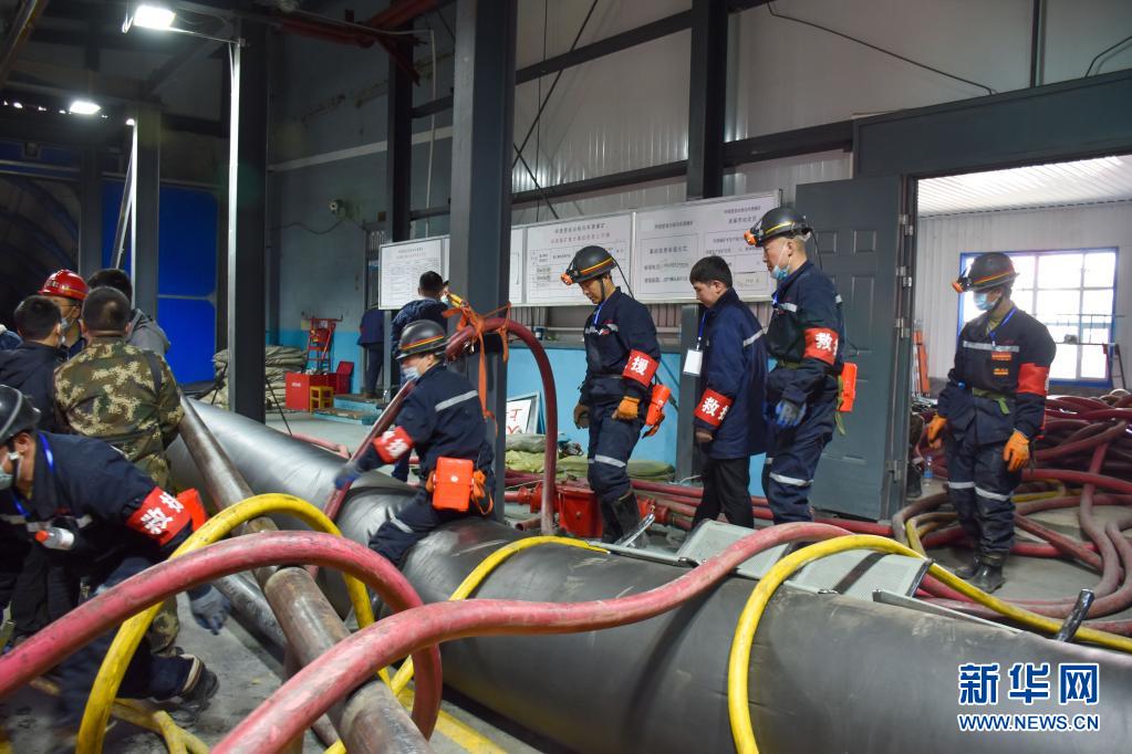 4月12日,在新疆昌吉回族自治州呼图壁县雀尔沟镇中煤五建丰源煤矿突发透水事故救援现场,救援人员准备进入煤矿副井入口处开展救援。