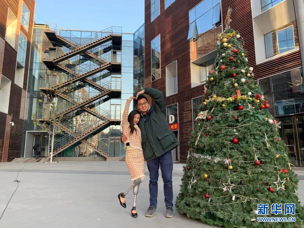 廖智(左)和丈夫启凡摆造型拍照(资料照片)。新华社发