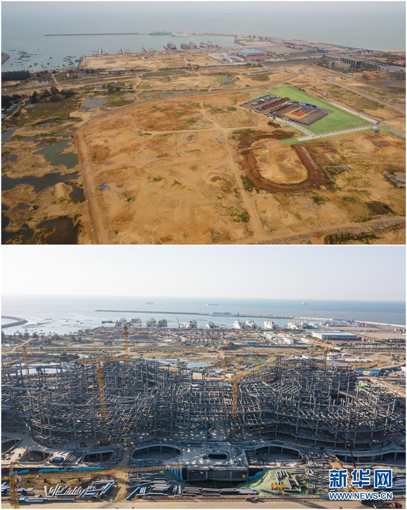 拼版照片:海口国际免税城项目(无人机照片,上图为2019年3月18日新华社记者杨冠宇摄,下图为2021年1月1日新华社记者蒲晓旭摄)。