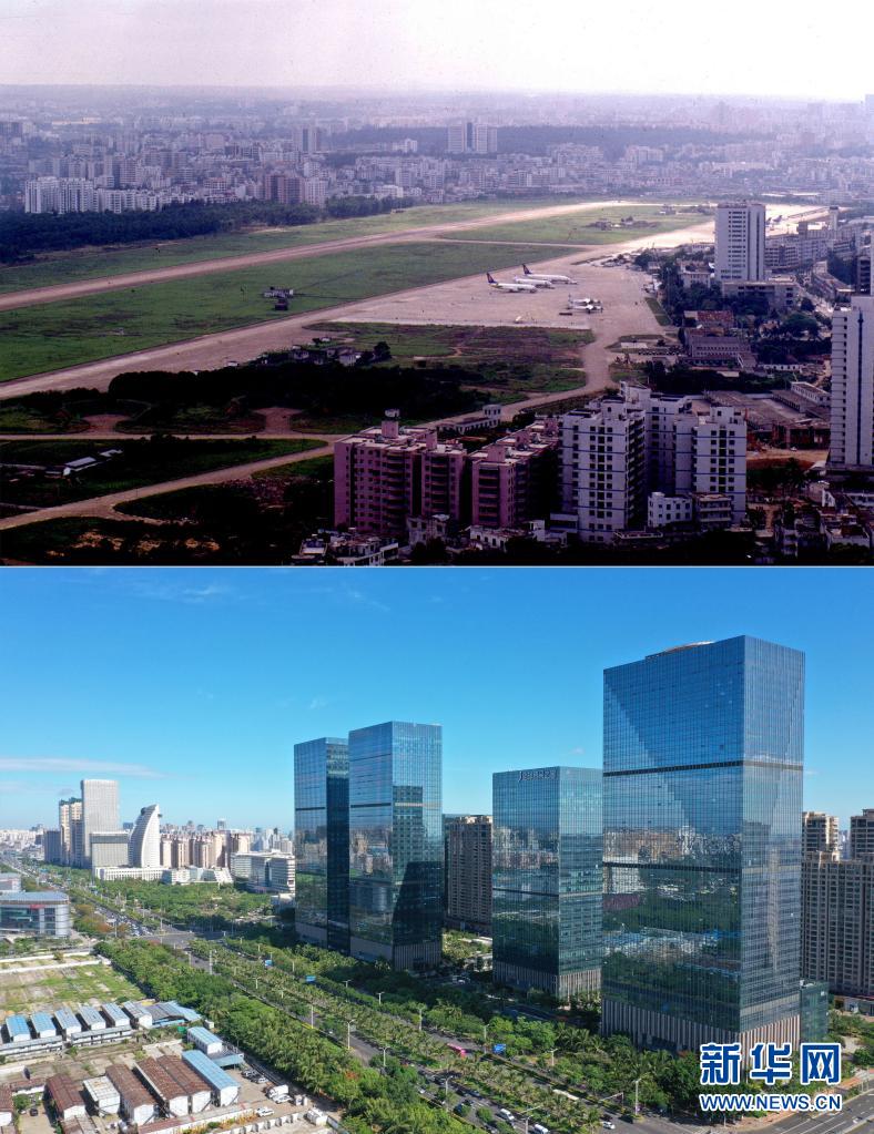 拼版照片:海口市国兴大道,曾经是海口大英山机场(上图为1999年5月新华社记者姜恩宇摄,下图为2020年6月18日新华社记者郭程摄)。