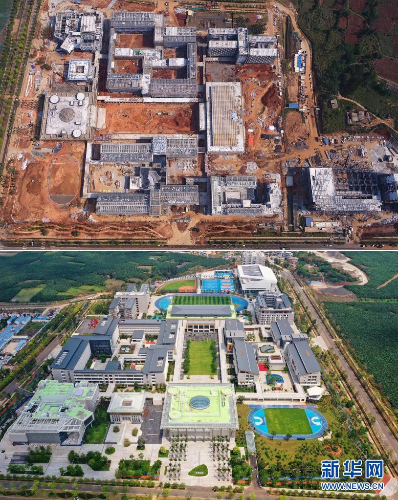 拼版照片:海南生态软件园内的iSchool微城未来学校(无人机照片,上图为2019年4月10日新华社记者杨冠宇摄,下图为2020年4月1日新华社记者郭程摄)。