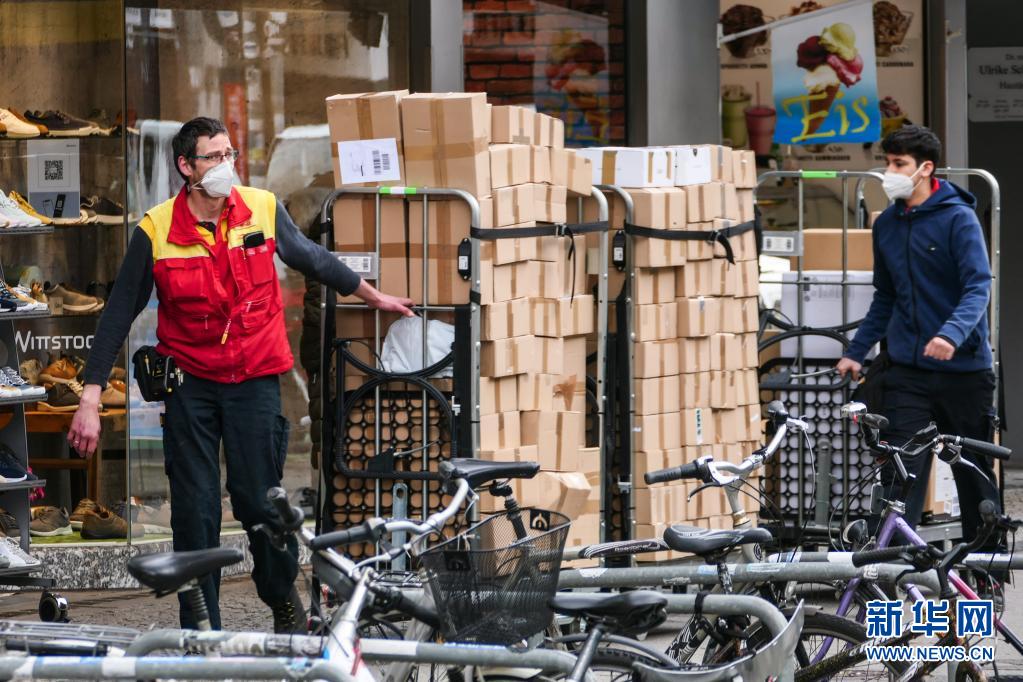 4月12日,在德国首都柏林,戴口罩的快递员在街头工作。