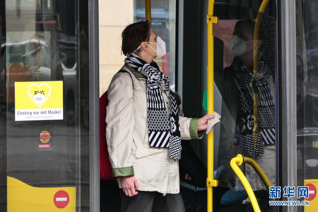 4月12日,在德国首都柏林,一名戴口罩的乘客站在公交车上。