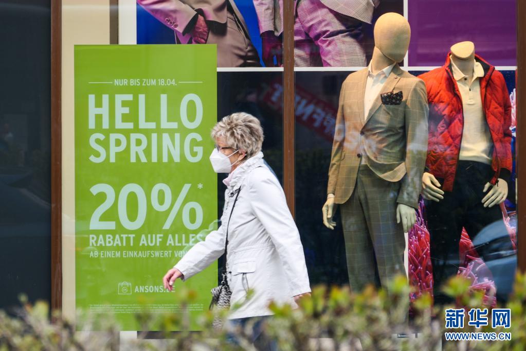 4月12日,在德国首都柏林,一名戴口罩的女子从一家商店前走过。