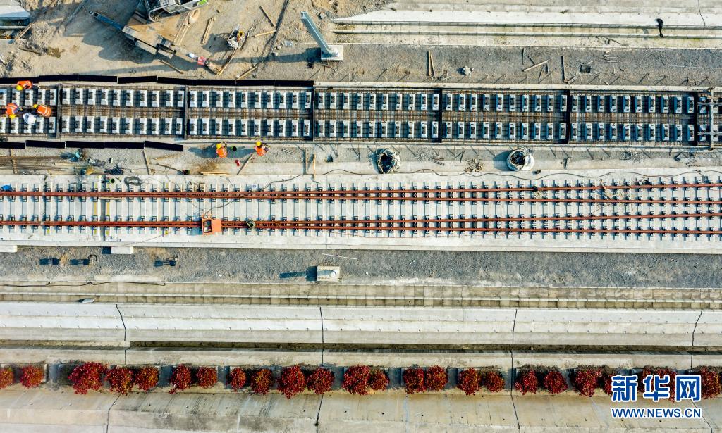 这是4月12日在郑万高铁南漳站拍摄的中铁十一局无砟轨道施工现场(无人机照片)。