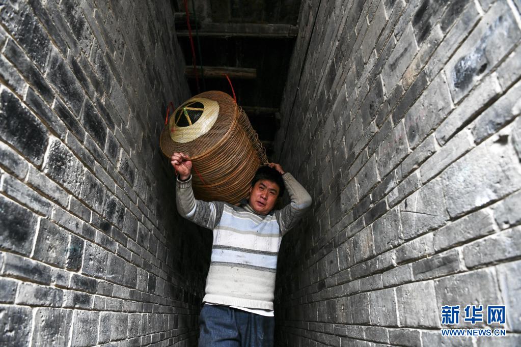 村民在贵州省三穗县瓦寨镇上街村再成斗笠加工厂搬运斗笠,准备装车外运销售(4月11日摄)。