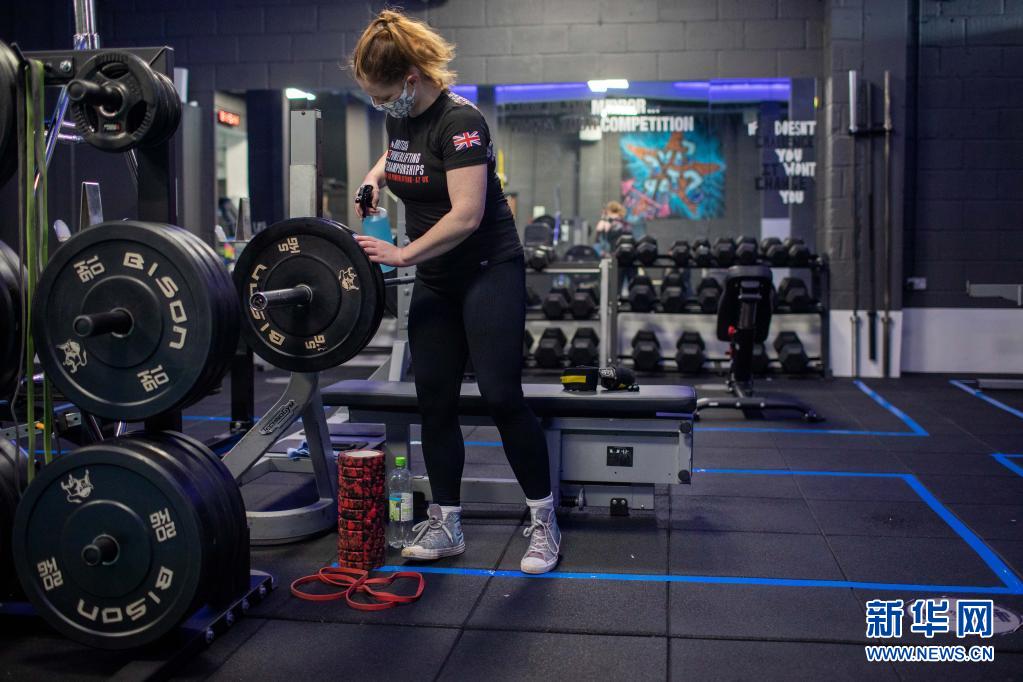 4月12日,一名工作人员在英国温莎的一家健身房内给设备消毒。