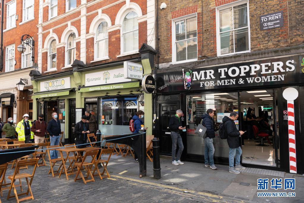 4月12日,人们在英国伦敦SOHO区的一家理发店外排队。