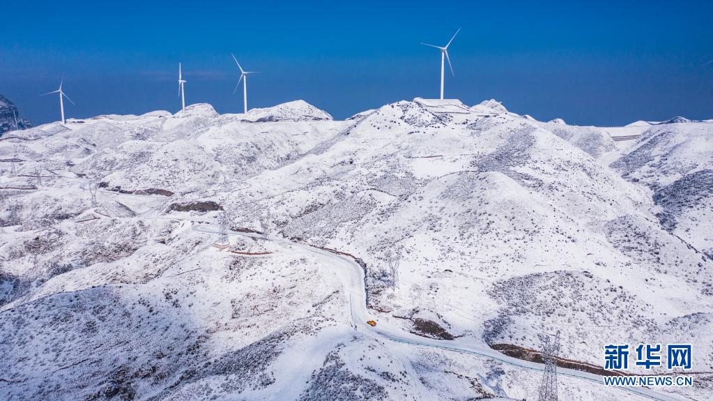 雪后的贵州盘县四格风电场(2021年1月12日摄,无人机照片)。