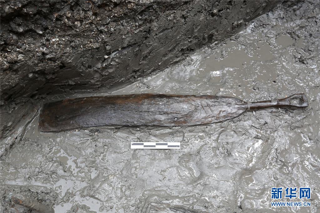 这是浙江宁波余姚井头山遗址出土的木桨(资料照片)。