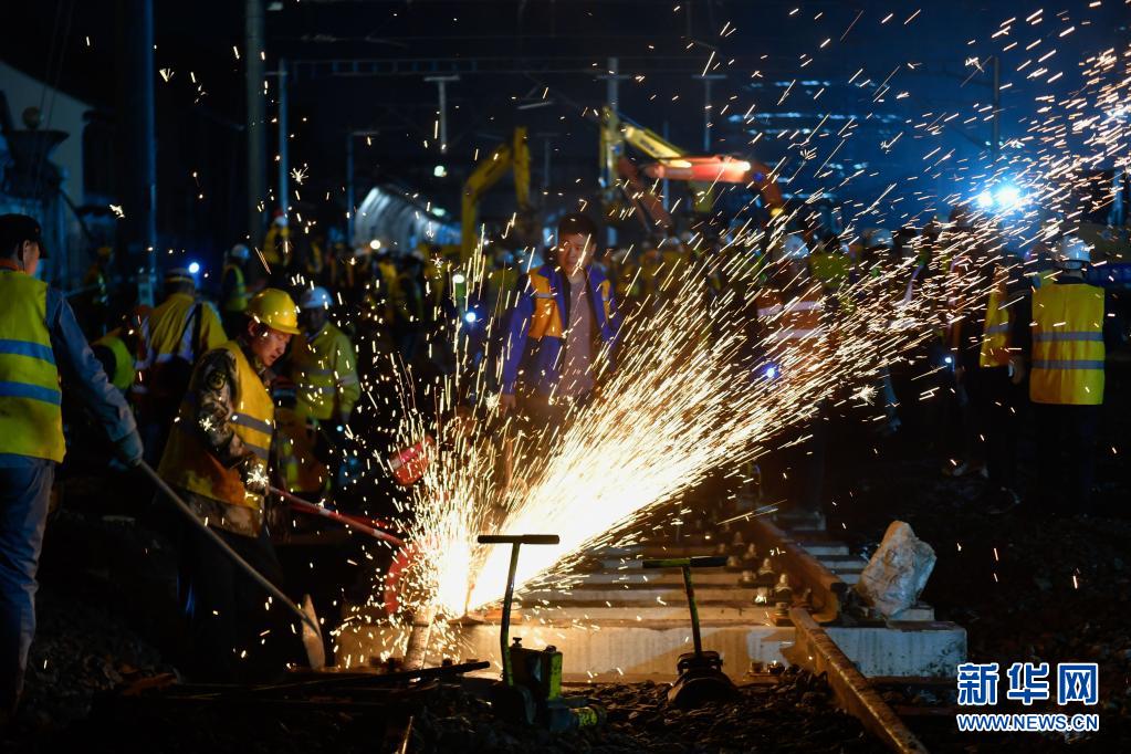4月13日,中铁四局工人在嘉兴站线路改造作业时切割铁轨。