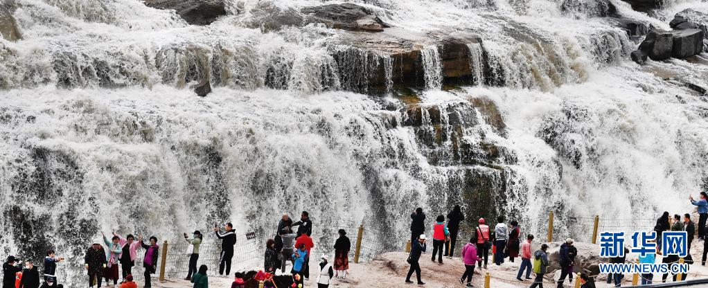 近日,随着黄河上游冰凌消融,位于秦晋峡谷的黄河壶口瀑布水量增大。游人纷纷前来观看“一里壶口十里雷,春水腾雾浪滔天”的壮观景象。